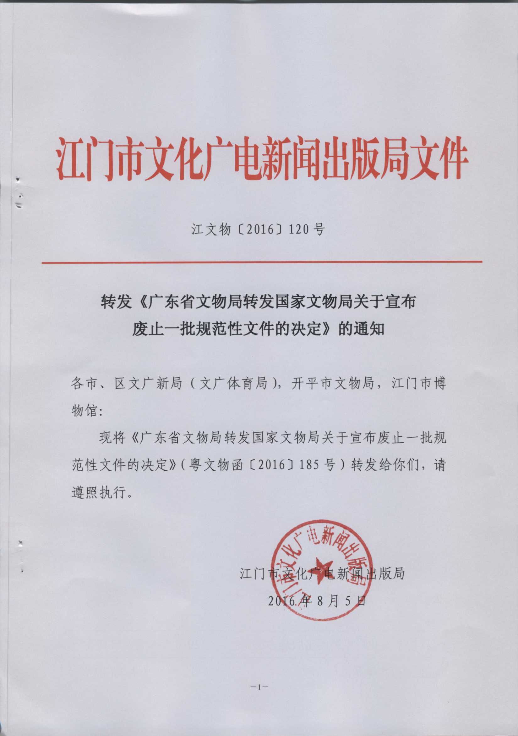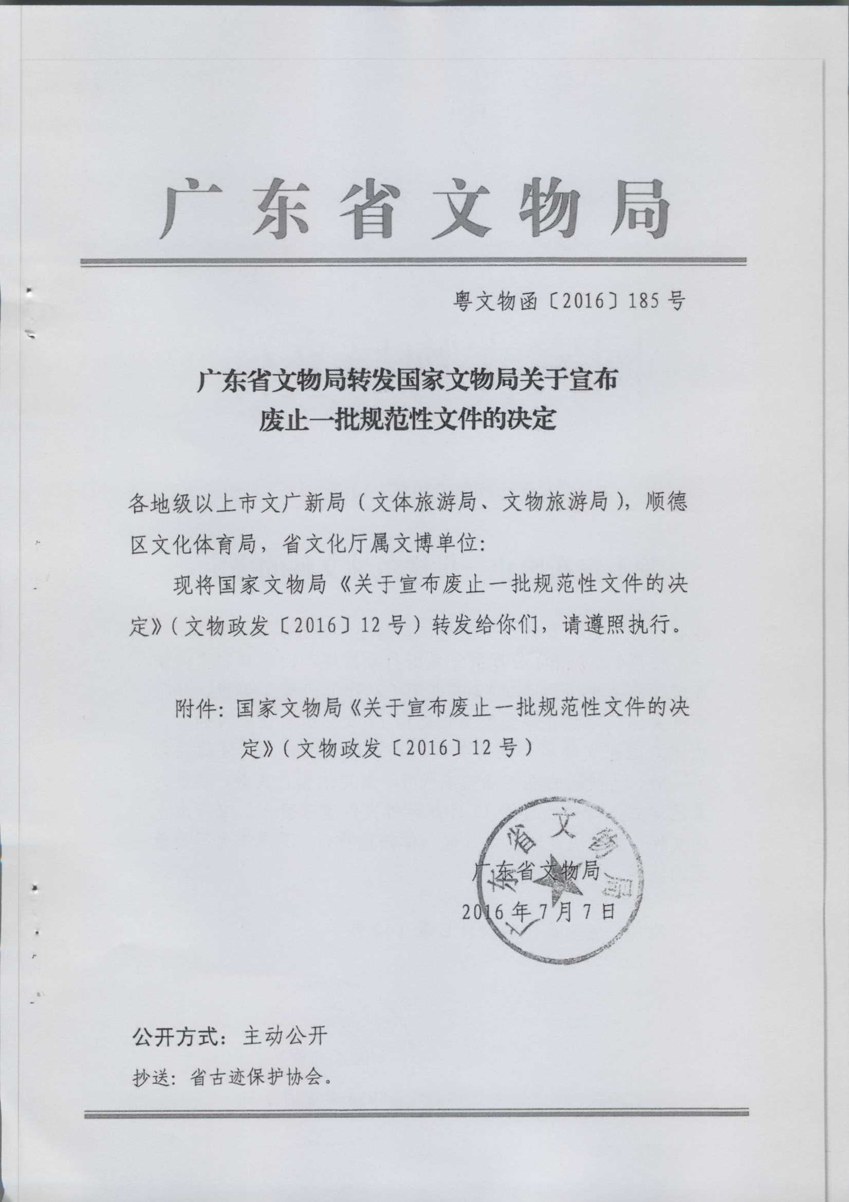 【文件】转发《广东省文物局转发国家文物局关于宣布废止一批规范性文件的决定》的通知(江文物〔2016〕120号)
