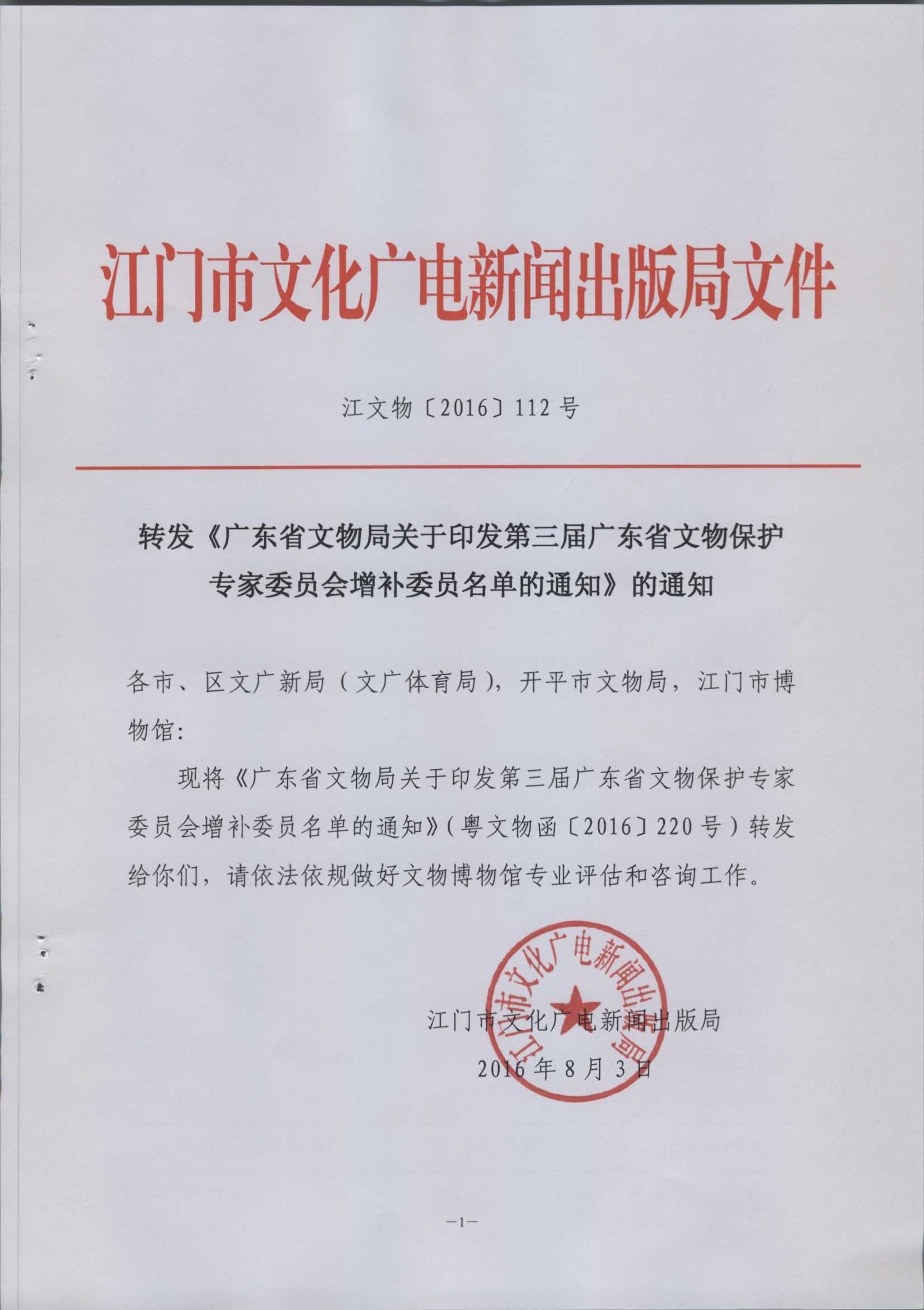 【文件】转发《广东省文物局关于印发第三届广东省文物保护专家委员会增补委员名单的通知》的通知(江文物〔2016〕112号)