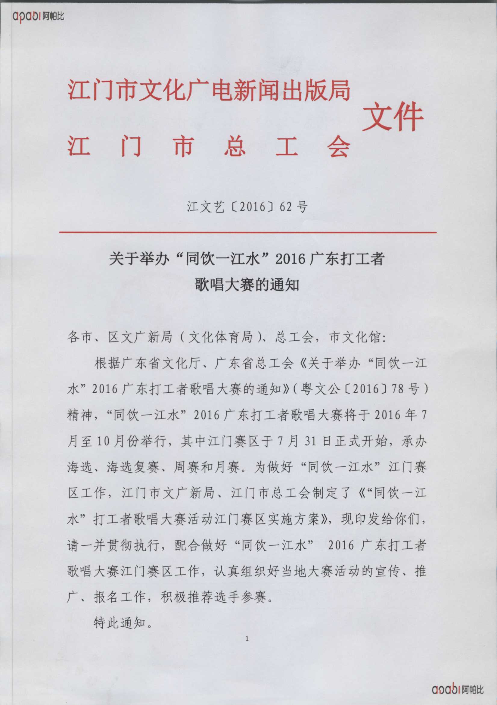 【文件】关于举办“同饮一江水”2016广东打工者歌唱大赛的通知(江文艺〔2016〕62号)