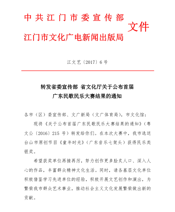 【文件】转发省委宣传部 省文化厅关于公布首届广东民歌民乐大赛结果的通知(江文艺〔2017〕6号)