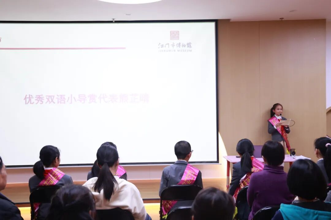 优秀双语小导赏代表熊芷晴上台分享:“虽然背稿子很辛苦很累,但是每次讲解结束,能够得到观众的掌声与鼓励,我觉得那些辛苦便化为了值得。”她说,自己会继续努力学习,提升导赏能力,让更多的人了解五邑的历史文化。