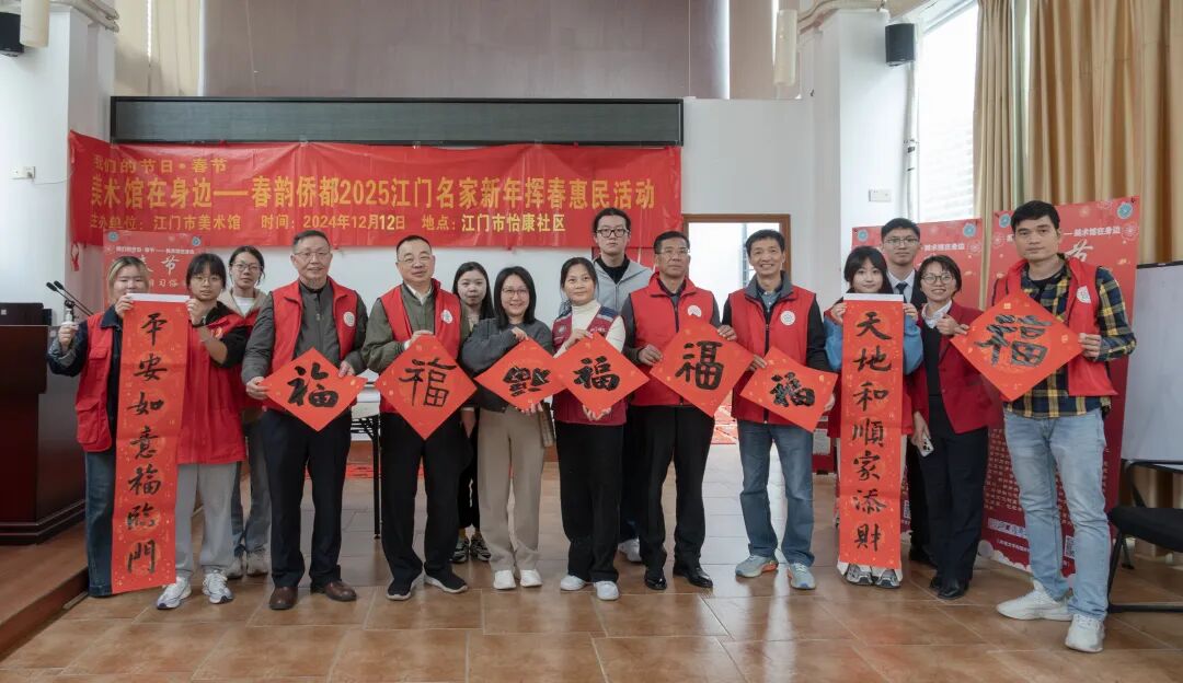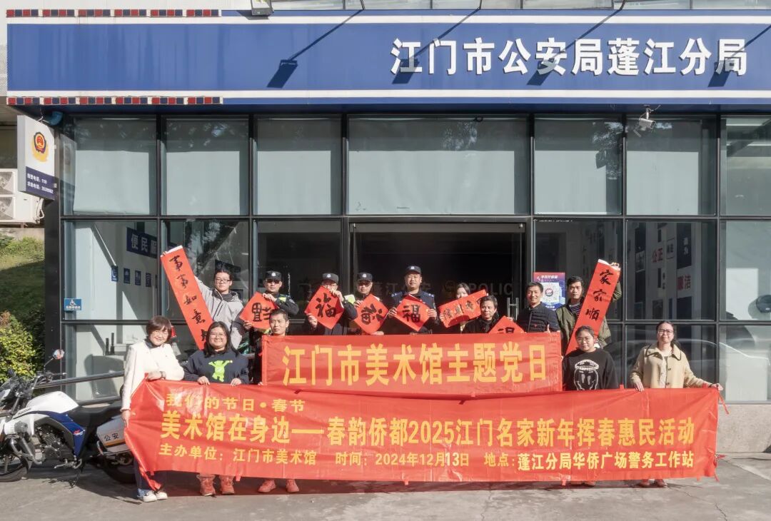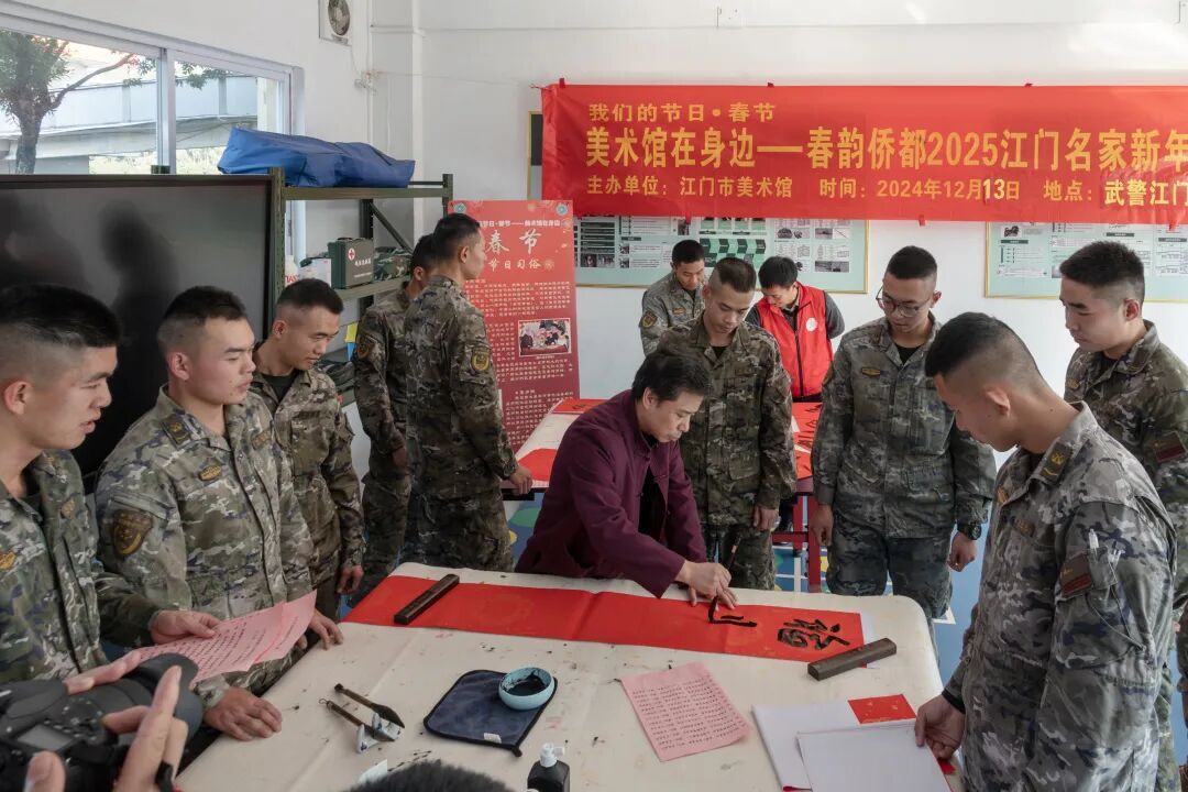 “墨韵辞旧年,丹青迎新春”写福字送春联,是书法家从笔尖上传递的年味,是春节传统祝福的具象化,也是中国独有的传统文化体现。“同圆侨都梦,文化进万家”,为传承中华优秀传统文化,营造喜庆、祥和文明的节日氛围,江门市美术馆于春节前举办“我们的节日——春韵侨都2025江门名家新年挥春惠民活动”,走进街道社区、市民广场、武警支队等,将新春的温暖与祝福传递给市民群众。