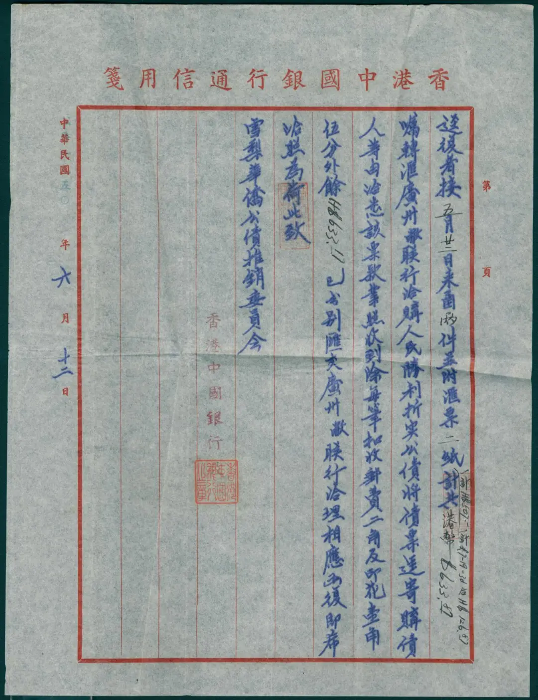 1950年香港中国银行发给澳大利亚华侨郑嘉乐的回函