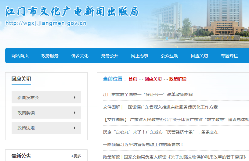 (一)加强公共文化服务政策信息公开。在原文广新局和原体育局均在网站设置了“政策解读”和“政策法规”专栏,用于进行政策法规宣传。加强对《中华人民共和国公共文化服务保障法》、《关于加强文物保护利用改革的若干意见》、《江门市海上丝绸之路史迹保护条例》等法律法规的解读和宣传。