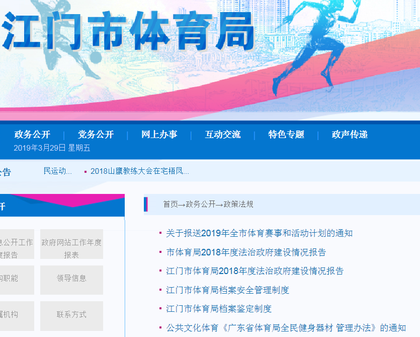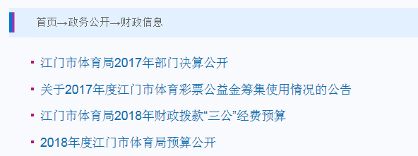 (一)政府信息公开平台主动公开政府信息情况。截至2018年12月31日,原市文广新局在江门市政府信息公开目录系统主动公开政府信息465条,其中工作动态345条,组织机构2条,部门文件45条,其他信息65条,财政预决算4条,政府信息公开年度报告1条,政府网站年度报表1条,行政执法1条,政府信息公开指南1条;原市旅游局在江门市政府信息公开目录系统主动公开政府信息116条,其中政府信息公开工作年度报告1条,政府信息公开指南3条,部门文件7条,工作动态89条,旅游景区等级评定推荐1条,行政执法10条,政府网站工作年度报表1条,组织机构4条;原市体育局在江门市政府信息公开目录系统主动公开政府信息291条,其中工作动态115条,组织机构3条,主动公开规范性文件0条,其他文件33条,办事指南类信息1条,财政预决算3条,政府信息公开年度报告1条,其他信息135条。