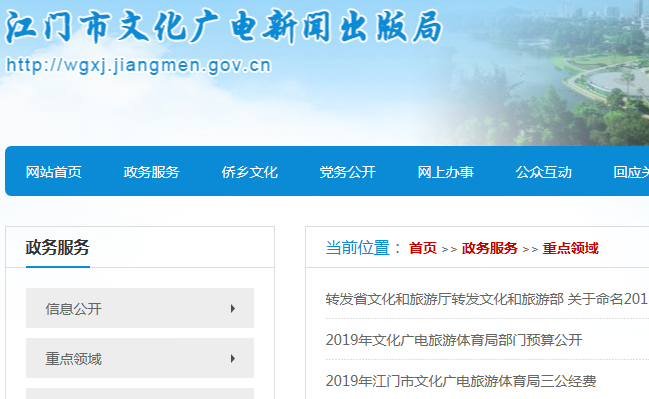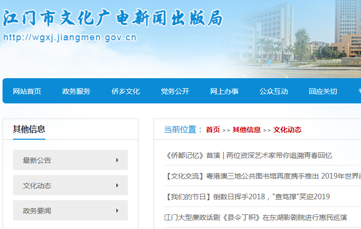 (二)加强门户网站建设。充分发挥原文广新局、原旅游局、原体育局网站的宣传和桥梁作用。一是根据市政府统一部署进行网站集约化,安全系数进一步提升。二是按照依法行政有关政务信息公开要求,原文广新局、原旅游局、原体育局在网站增加行政审批、行政执法公示专栏,并根据省、市行政审批链接变更情况,及时调整更新了“广东政务服务网”的链接,方便群众办事。