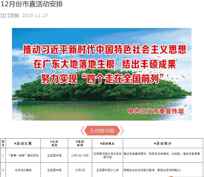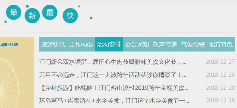 (四)主动公开公益性文化服务活动信息。在原文广新局、原旅游局、原体育局网站设置了活动动态专栏,用于公开活动的动态信息,包括:活动预告、活动回顾等,活动种类包括:文艺演出、晚会、展览、读者互动、体育活动、旅游活动等信息。