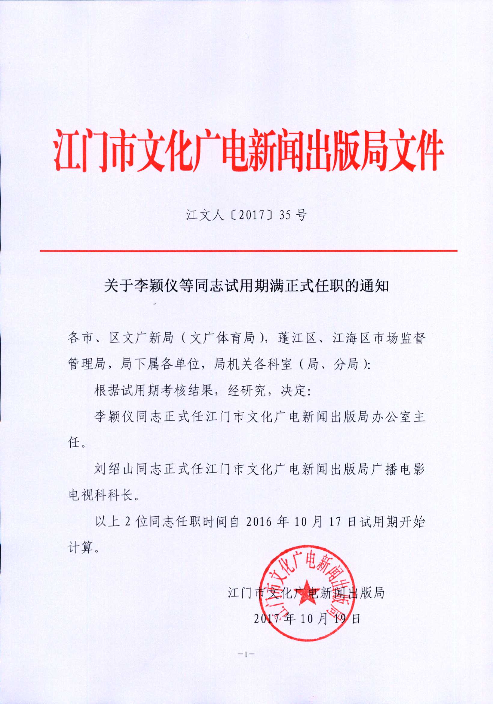 【文件】关于李颖仪等同志试用期满正式任职的通知(江文人〔2017〕35号)