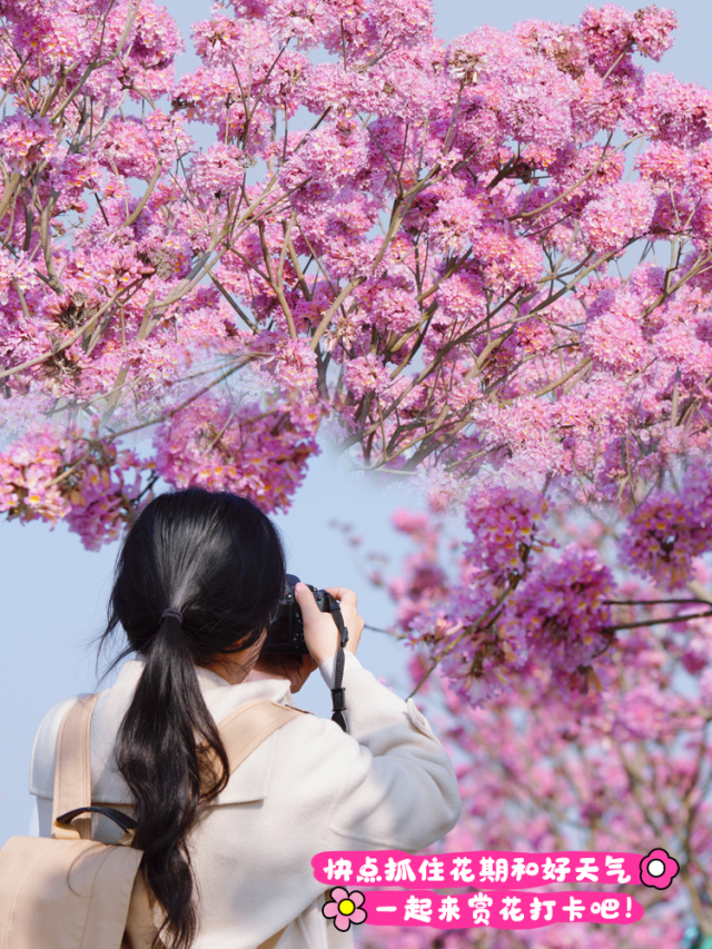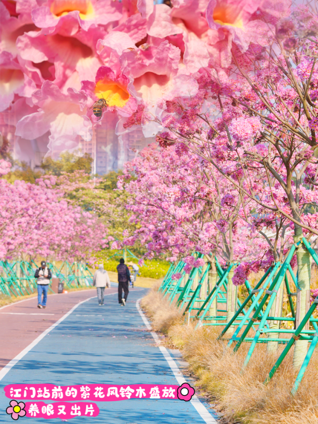 今天我请客请大家赏浪漫紫色花海生活在江门这座城市,一年四季都有惊喜——这不,江门又有新的花海开放啦!那就是——紫花风铃木。近日,江门站前的紫花风铃木盛开,静静驻足观赏,沉浸于梦幻色彩中,心情瞬间被治愈。抬头一望,你就可以看见紫粉的花球挂在枝头,与蔚蓝的天空交相辉映,令人陶醉。再咔嚓按下快门,就可以拍出一张美美的照片了。花海免费参观,趁着阳光灿烂,快换上美美的服装,拍出大片啦。