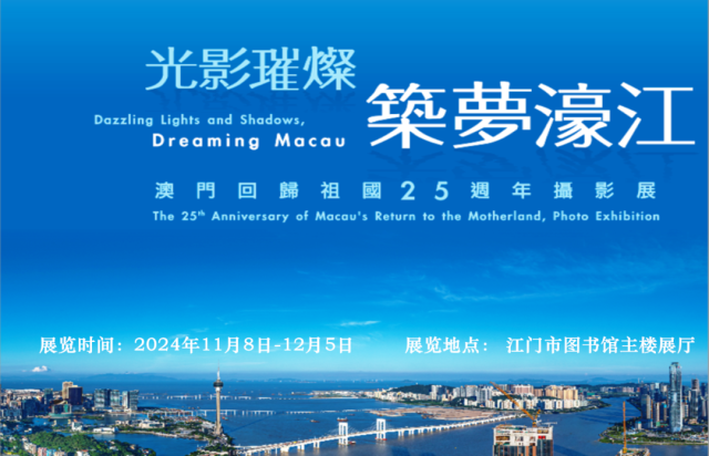 影像是集体记忆的再现和文化传承的重要载体。透过影像画面的解构与重组,可从宏观的视野理解城市的发展变迁及其独特的文化内涵。为庆祝中华人民共和国成立75周年暨澳门回归祖国25周年,向广大市民读者展示粤澳两地融合发展的成果,由江门市图书馆、澳门科技大学图书馆、澳门影像馆联合举办“光影璀璨,筑梦濠江——澳门回归祖国25周年”摄影展,展览于11月8日至12月5日在江门市图书馆主楼展厅展出。