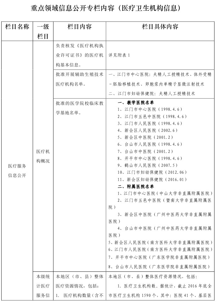 重点领域信息公开专栏内容(医疗卫生机构信息2016年)