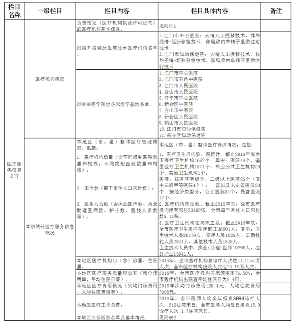 重点领域信息公开专栏内容(医疗卫生机构信息2018年)