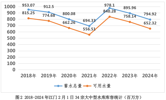 (三)水情:1月份西江来水平均流量2620m3/s,比常年少5%。2月1日,34宗大中型水库蓄水总量794.92百万方,较常年同期少5%,蓄水总量占总正常库容比例为61%,可用水量652.32百万方,占总兴利库容比例为56%;21宗供水水库蓄水总量625.4百万方,较常年同期多27.38百万方,可用水量503.86百万方,占兴利库容比例64%。
