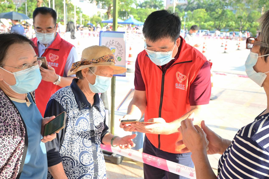 10月的深秋依旧艳阳高挂,周边前来做核酸的市民群众排起长长的人龙。“志愿者们很有耐心,今天多亏了他们,帮我弄好了健康码,不然还不知道什么时候可以做核酸。”现场一名头发花白的老人连声发出感谢。在核酸检测队伍中,不会使用智能手机的老人还有很多,每当有老人前来询问,市建管中心的志愿者们都会详细一一解答,协助登陆个人信息,帮助他们完成核酸检测码的生成,确保核酸检测现场高效有序。虽口干舌燥、疲惫不堪是常态,但志愿者们仍然耐心细致地服务好每一位有需要的市民群众。