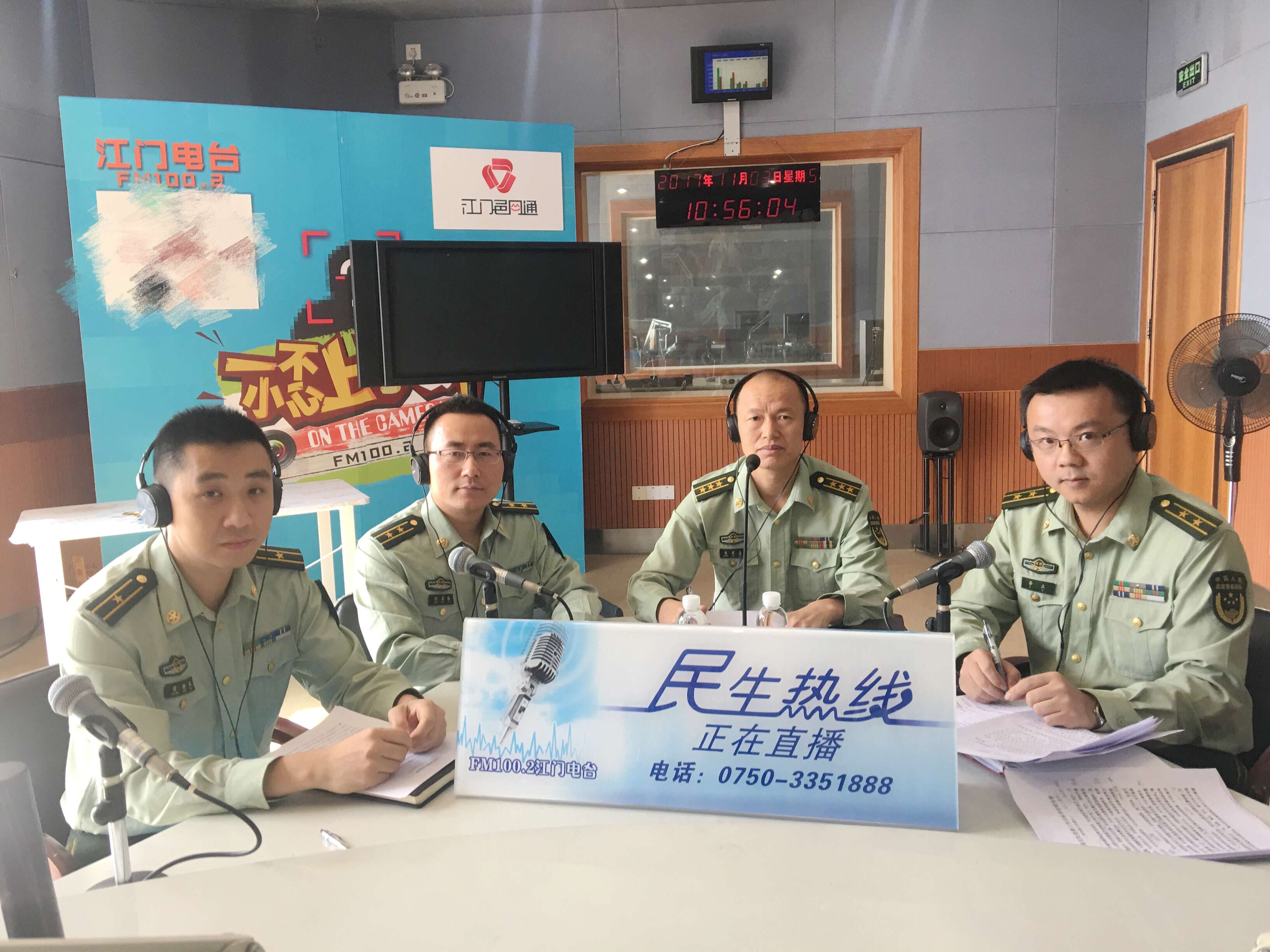 在第581期的《民生热线》节目中, 江门市公安消防局局长张有志、司令部参谋长李立、防火处处长范会强、办公室主任黄晓斌就“全国消防日”宣传活动的开展,当前消防工作重点,消防便民、利民服务的提升等热点话题,通过热线电话、微信、短信平台与听众进行了直接沟通。