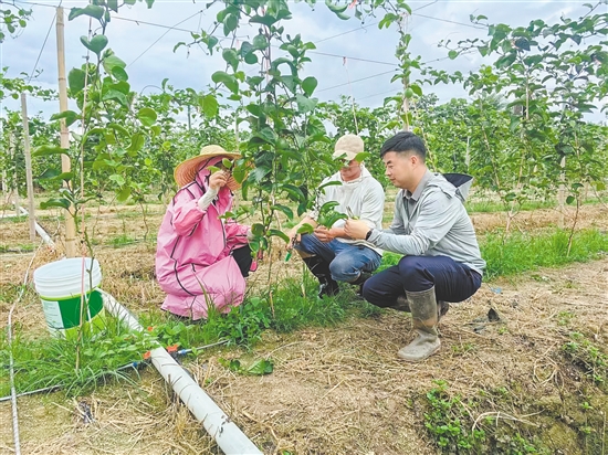 市政府办公室创新引入“三方合作”机制,引进黄金百香果等系列农产品种植项目。图为驻镇帮扶干部与种植户在探讨黄金百香果种植技术。