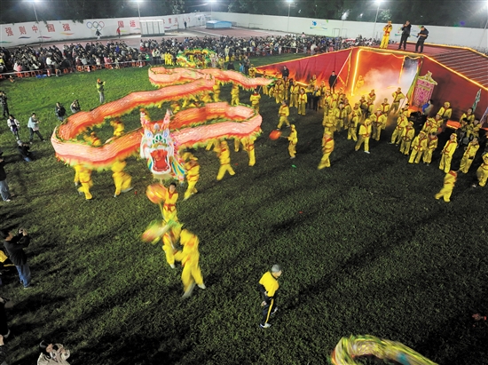 舞龙桥、跨禹门、龙上水……在锣鼓声中,52米长的荷塘纱龙在上百名舞龙者的舞动下显得栩栩如生,共展示出30多种“花式动作”,引得大家频频叫好。
