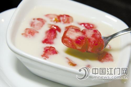 粉红宝石。不得不说,在江门街,这样有诱惑力的甜品为数不多。浓郁的椰香鲜奶里,一颗颗“粉红宝石”是若隐若现,晶莹剔透的它颜色很自然,像成熟的红桃。我勺起两颗“宝石”仔细端详:质地细腻的它有点QQ糖的质感,但又不像QQ糖那般一眼看穿。老板卢小姐神秘兮兮地说:“先尝一口吧,惊喜在后头呢!”一口咬下,外层“烟韧”嫩滑,红提汁的味道瞬间迸发,还夹杂着椰奶香。嗯?这里头爽口清甜,好过瘾!原来是马蹄粒!“你的嘴还真灵!”卢小姐“开古”了,“这道甜品很考功夫,是我在上海无意间吃到,但当时没有用椰奶浸泡,也并非粉红色。冬天椰奶诱人,我们便突发奇想用椰奶煮上一碗‘粉红宝石’。果肉爽口饱满的马蹄粒是关键,切粒后在秘制的薯粉酱里‘游一圈’,两分钟后马上捞起,在鲜榨红提汁里‘过一下冷河’备用,最后配合温热的鲜奶椰浆一起上,非常经典。”椰奶浓香和“粉红宝石”配合得天衣无缝,红提汁的颜色尽管只是用于染色,但是仍有淡淡新鲜提子汁的味道,重点是鲜榨的,健康无添加剂。