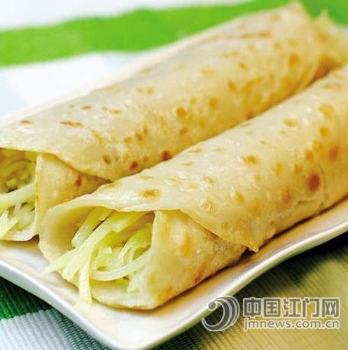 D、等面皮稍稍冷却后,将土豆丝放在面皮上,卷成饼即可。