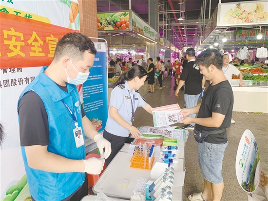 市场监管执法人员在农贸市场开展食用农产品快检工作,守护“舌尖上的安全”。