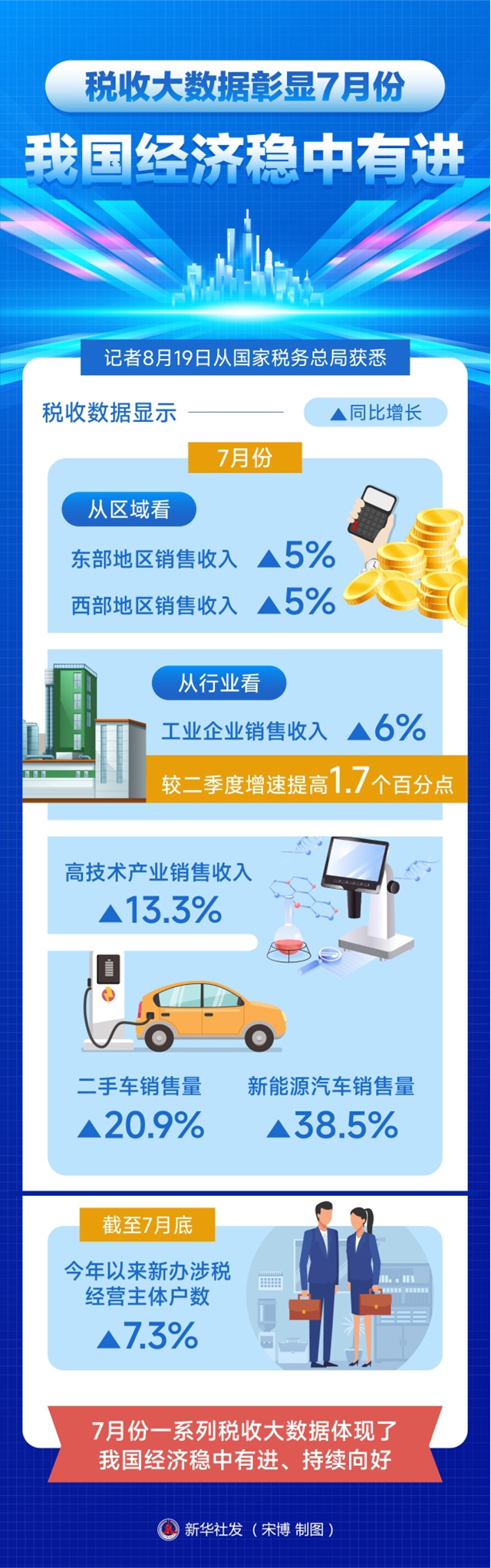 记者8月19日从国家税务总局获悉,最新公布的增值税发票数据显示,7月份我国经济运行总体平稳,并呈现稳中有进的积极态势,高质量发展扎实推进。