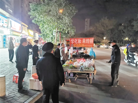 宵夜食肆占道经营,人行道上布满油渍与垃圾……为进一步改善城市市容环境,规范市场经营秩序,形成常态化管理机制,1月13日晚,市城管局组织三区城管、公安、市场监管等部门,集中开展店铺出店经营、流动摊档占道经营整治行动。