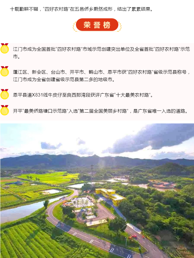 农村公路,是支撑乡村发展的“毛细血管”。党的十八大以来,江门市深入贯彻习近平总书记关于“建好、管好、护好、运营好”农村公路的重要指示精神,把建设“四好农村路”作为推进乡村振兴和增进民生福祉的重要抓手,精心打造“畅、安、舒、美”的致富路、民心路、幸福路。侨乡大地上,一条条宽敞平整的“四好农村路”畅乡通村,宛如玉带般蜿蜒盘旋在绿水青山、碧野田畴之间,把生态旅游、人文历史、风土人情等资源串珠成链,勾勒出乡村振兴的美好画卷。