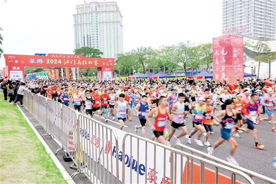 去年举办的2023江门马拉松赛在跑友圈中赢得不错的口碑。本届赛事在赛道设置、交通引导、志愿者培训、医疗保障、安全保障、食宿保障、功能区流线规划等方面作了精心安排。今年的赛道相比去年进行了优化,路线跨越三区,起点在五邑华侨广场、欢乐跑终点在滨江体育中心、半程马拉松终点在白水带体育公园、全程马拉松终点在新会人民会堂,途经众多重要人文地标和自然景观,让跑者们在历史与现代的交融中尽情领略江门城市的精华风光。今年赛道一路平缓少坡,相较去年难度降低,不少跑友都跑出了个人最佳成绩。32个氛围点各具特色,江门特色节目轮番上阵,各支队伍热情展演,为选手们加油助威,锣鼓声、欢呼声此起彼伏,赛道气氛瞬间被点燃。